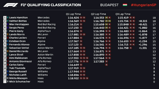Q3汉密尔顿凭借1:15.419的成绩,拿到在亨格罗宁赛道的第8个杆位,他也超越舒马赫,成为在这里拿到杆位次数最多的车手!博塔斯排名第二,梅赛德斯车队本赛季第二次包揽头排发车位!维斯塔潘以1:15.840秒排名第三,佩雷兹第四,两部红牛将占据第二排发车位 。阿斯顿-马丁车队维特尔进入到了Q3位列第10。