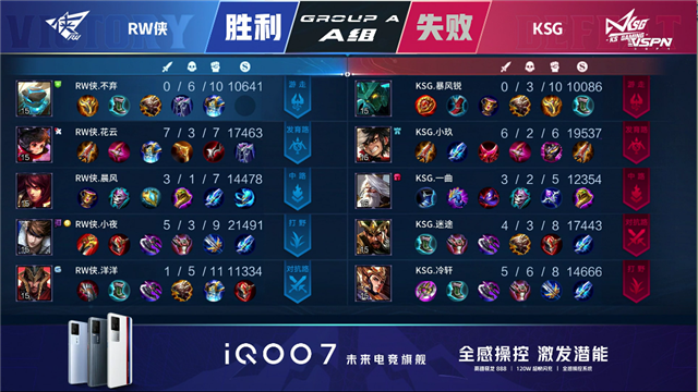 2分26秒,RW侠拿下先知主宰。3分05秒,下路团,双方1换1。5分05秒,RW侠拿下暴君。5分17秒,RW侠破掉KSG下一塔。5分32秒,上路团,KSG打出0换2,阿古朵拿下双杀。6分37秒,RW侠中路击杀阿古朵。7分58秒,RW侠拿下先知主宰。8分19秒,双方团,KSG打出1换3,马超拿下三杀。8分50秒,KSG连续破掉RW侠中路两座外塔。9分20秒,KSG打出1换4并破掉RW侠中高地。9分55秒,KSG拿下暴君。10分42秒,KSG破掉RW侠上二塔。11分52秒,KSG拿下暗影暴君。12分46秒,KSG破掉RW侠下二塔。13分10秒,KSG强点掉RW侠下高地。14分47秒,KSG破掉RW侠上高地。15分04秒,高地团,KSG团灭对手,随后一波破掉RW侠水晶3:2赢下比赛!
