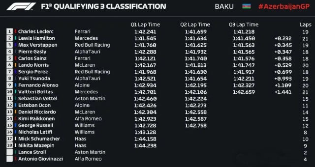 好球直播讯 6月5日,2021赛季F1阿塞拜疆大奖赛的排位赛在巴库赛道激情上演,经过三个阶段的激烈竞争,最终,法拉利车队的勒克莱尔夺得杆位,梅赛德斯车队的汉密尔顿第二,红牛车队的维斯塔潘第三。