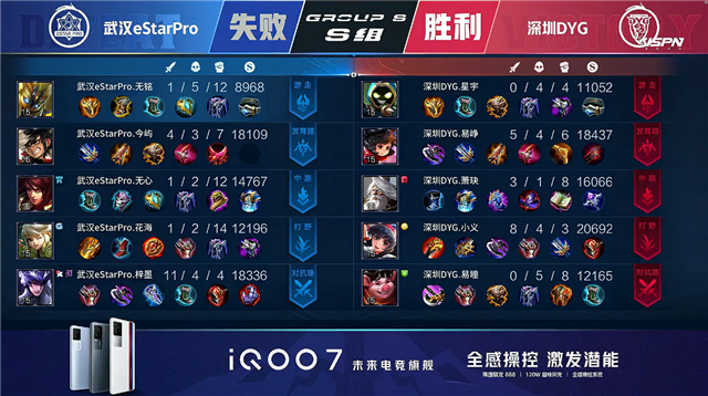 开局深圳DYG周瑜换线到对抗路。2分05秒深圳DYG下路击杀公孙离拿到一血。2分22秒武汉ES上路击杀周瑜。2分30秒深圳DYG拿下暴君。3分58秒下路团战深圳DYG打出1换2,裴擒虎拿到二连击破。5分30秒武汉ES下路打出0换2。深圳DYG裴擒虎中路单杀娜可露露。6分12秒野区团战武汉ES打出0换2,深圳DYG摧毁敌方中路外塔。6分55秒武汉ES拿下暴君。7分18秒武汉ES下路击杀梦奇。7分31秒武汉ES下路击杀裴擒虎。8分09秒武汉ES拿下主宰。9分54秒武汉ES中路击杀大乔。10分22秒武汉ES拿下暗影暴君。10分35秒武汉ES主宰处击杀梦奇。11分04秒武汉ES摧毁敌方上路二塔。11分28秒武汉ES拿下暗影主宰。12分08秒武汉ES野区击杀裴擒虎。12分17秒武汉ES摧毁敌方中路外塔。12分51秒武汉ES中路击杀周瑜。13分15秒武汉ES摧毁敌方下路高地塔。15分11秒上路团战双方1换1。16分10秒武汉ES拿下暗影主宰。18分52秒武汉ES上路击杀大乔。20分37秒中路团战武汉ES打出0换2。21分06秒武汉ES摧毁敌方水晶拿下比赛。