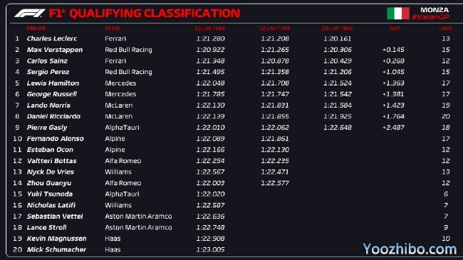 2022年F1意大利大奖赛排位赛成绩表: