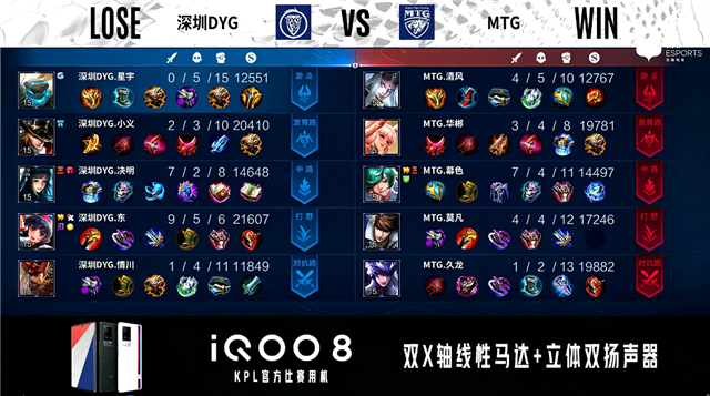 双方常规开局,1分29秒深圳DYG野区团战打出1换3。21分22秒MTG对抗路击杀夏侯惇。4分04秒野区团战MTG打出1换3。5分01秒MTG摧毁敌方中路外塔。5分57秒MTG野区击杀不知火舞。8分07秒MTG拿下暴君。10分29秒MTG拿下暗影主宰。10分54秒MTG拿下暗影暴君。11分42秒MTG摧毁敌方中路高地塔。12分33秒MTG摧毁敌方发育路高地塔。13分42秒MTG摧毁敌方水晶拿下比赛。