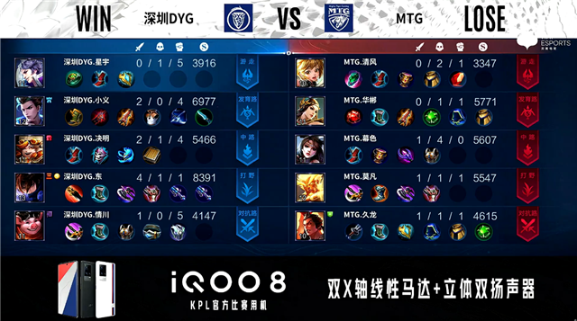 双方常规开局。2分10秒深圳DYG拿下主宰,MTG拿下暴君。3分30秒野区团战深圳DYG打出1换3,西施拿到三连决胜。4分57秒对抗路团战深圳DYG打出0换3。5分41秒深圳DYG野区打出0换2。5分59秒深圳DYG摧毁敌方对抗路二塔。7分36秒深圳DYG对抗路打出0换2。7分54秒深圳DYG摧毁敌方中路外塔。8分30秒深圳DYG抢到主宰。8分55秒深圳DYG摧毁敌方中路二塔。9分05秒深圳DYG摧毁敌方发育路二塔。10分21秒深圳DYG拿下暗影暴君。10分52秒深圳DYG拿下暗影主宰。12分31秒深圳DYG发育路击杀公孙离。12分59秒高地团战双方1换1,深圳DYG摧毁敌方中路、发育路高地塔。14分23秒中路团战MTG打出0换3。15分38秒MTG对抗路击杀娜可露露。17分56秒野区团战MTG打出0换2。20分20秒发育路团战MTG打出2换4,庄周拿到三连决胜。20分57秒MTG发育路击杀廉颇。21分39秒MTG拿下风暴龙王。24分12秒中路团战MTG打出3换4。26分30秒MTG拿下风暴龙王,深圳DYG打出1换2。28分37秒MTG摧毁敌方水晶拿下比赛。