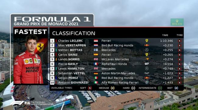 篮球直播吧讯 北京时间5月22日晚,2021F1摩纳哥大奖赛排位赛结束。经过1个多小时的比拼,尽管因为撞墙引发红旗导致排位赛提前结束,但法拉利车手勒克莱尔还是以1分10秒346的成绩,在主场拿下了赛季首个杆位,维斯塔潘落后0.230秒排名第二,博塔斯落后0.255秒排名第三。P4-P10分别为:塞恩斯、诺里斯、加斯利、汉密尔顿、维特尔、佩雷兹和吉奥维纳兹。正赛将在北京时间23日晚21点开始。