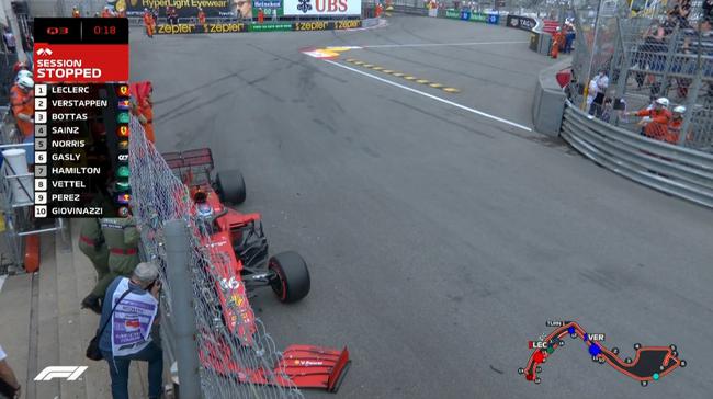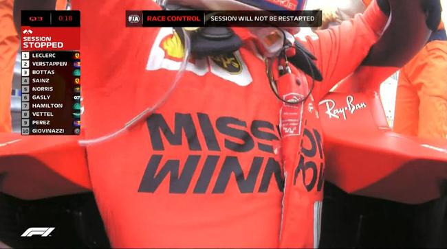 Q3开始后,维斯塔潘在第一个飞驰圈做出1分10秒576排名第一,领先博塔斯0.060秒。不过此后,勒克莱尔以1分10秒346超越维斯塔潘升至第一。在排位赛还剩5分钟时,10位车手排名为:勒克莱尔、维斯塔潘、博塔斯、塞恩斯、诺里斯、加斯利、汉密尔顿、维特尔、佩雷兹和吉奥维纳兹。在Q3剩下不到3分半时,所有车手重回赛道,准备最后冲刺。然而,在比赛还剩18秒结束时,排名第一的勒克莱尔撞墙,引发红旗,排位赛Q3就此结束,不再重启。