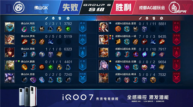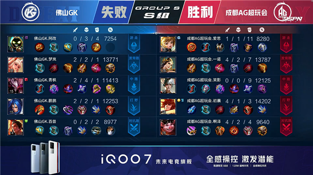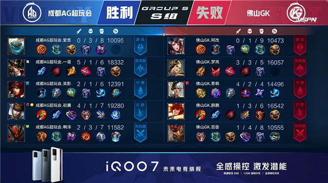 开局佛山GK入侵野区未果。1分10秒成都AG廉颇野区单杀阿古朵拿到一血。3分25秒成都AG下路打出0换2,鲁班七号拿到二连击破。5分26秒成都AG下路击杀黄忠。7分06秒上路团战成都AG打出0换2,鲁班七号拿到二连击破。7分51秒中路团战成都AG打出0换2。9分13秒团战成都AG打出0换2并摧毁敌方上路高地塔。9分35秒成都AG摧毁敌方中路高地塔。10分57秒成都AG摧毁敌方下路高地塔。11分20秒高地团战成都AG打出0换2。11分29秒成都AG摧毁敌方水晶拿下比赛。