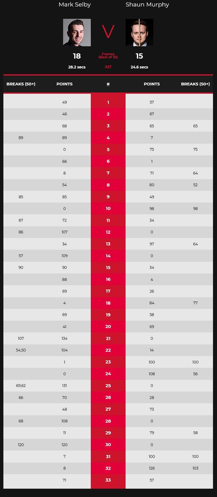 第26局,塞尔比开局延续第三阶段的良好状态,而墨菲依旧被对手抑制。塞尔比打出单杆66分,70-28再胜一局,15-11领先。第27局,依旧落后四局的墨菲顽强反击,他以73-49扳回一局,比分追成15-12。第28局,墨菲解球失误,塞尔比108-0再下一城。