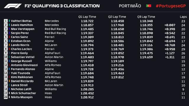维斯塔潘在做成绩是遭遇慢车影响,暂时落后博塔斯0.398秒位列第3位,汉密尔顿和博塔斯最后时刻也未能再刷新之前的成绩,这也意味着梅赛德斯双车包揽发车头牌,维斯塔潘位列第3位,佩雷兹、赛恩斯、奥康位列4-6位。