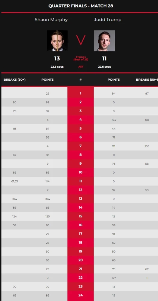 第9局,特鲁姆普凭借单杆58分,以76-9先胜一局,大比分5-4领先。此后墨菲开始发威。他先是在第10局轰出单杆85分,又在第11局轰出单杆61分和53分,以85-0和114-0连续2局零封获胜,大比分6-5反超。第12局,特鲁姆普再次红绸单杆59分,以92-7将大比分扳为6-6平,双方进入局间休息。