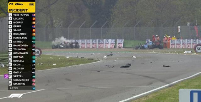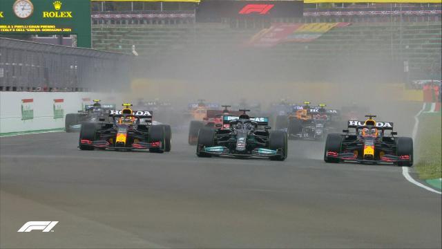 比赛开始前,伊莫拉赛道开始下雨,加斯利、奥康、米克·舒马赫和马泽平选择全雨胎起步,其他人则选择半雨胎。维特尔因为车组未能及时完成维修赛车引擎过热的问题,从维修区起步。发车阶段,杆位出发的汉密尔顿被两辆红牛赛车包夹,P3起步的维斯塔潘起步即超越队友佩雷兹,又在第一弯超越汉密尔顿,来到领跑的位置,在这次超越中,汉密尔顿的赛车前翼也因为碰撞受损。威廉姆斯车队拉提菲与马泽平发生碰撞,赛车上墙,安全车出动。维斯塔潘、汉密尔顿、勒克莱尔分列前三。