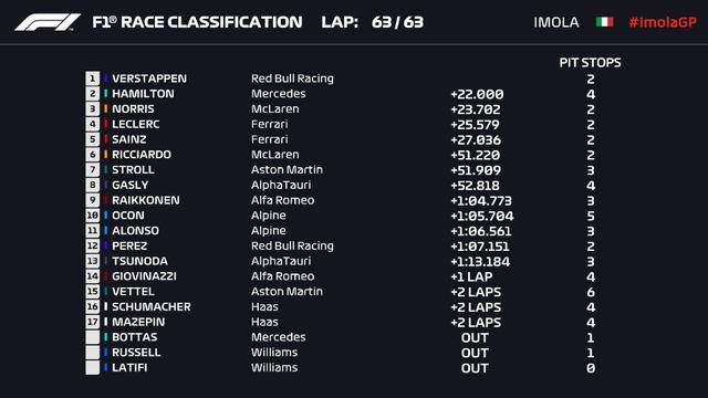最终维斯塔潘率先冲线,这也是他生涯首次在意大利境内的大奖赛夺冠,汉密尔顿获得亚军并获得最快圈速奖,诺里斯获得季军及本场最佳车手。排名4到10位的分别是勒克莱尔、塞恩斯、里卡多、斯特罗尔、加斯利、莱库宁、奥康。在本站比赛之后,汉密尔顿凭借本站的最快圈额外积分,在车手积分榜上以1分微弱优势领先维斯塔潘,排名第一。