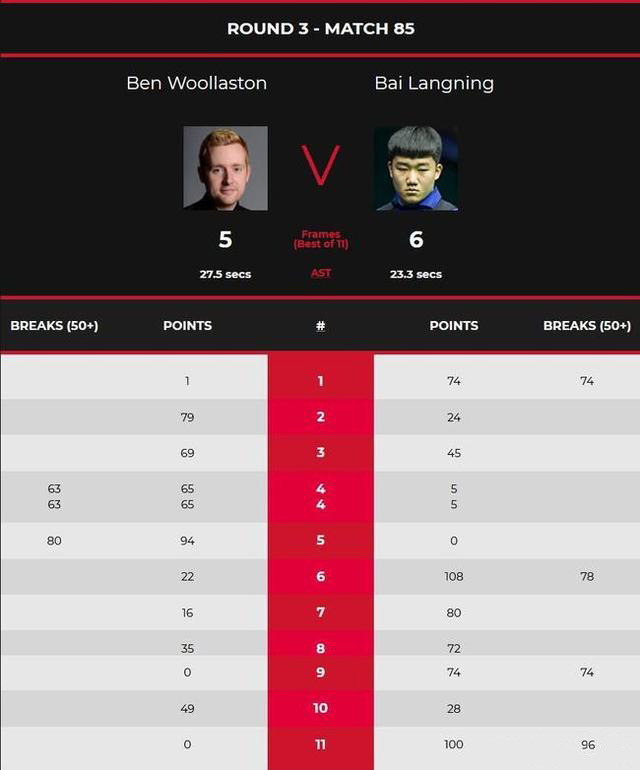 篮球直播吧讯 北京时间4月12日,斯诺克世锦赛资格赛第三轮,中国小将白朗宁对阵本-沃拉斯顿,最终,白朗宁爆出了冷门,在1-4落后的情况下6-5绝杀了沃拉斯顿。