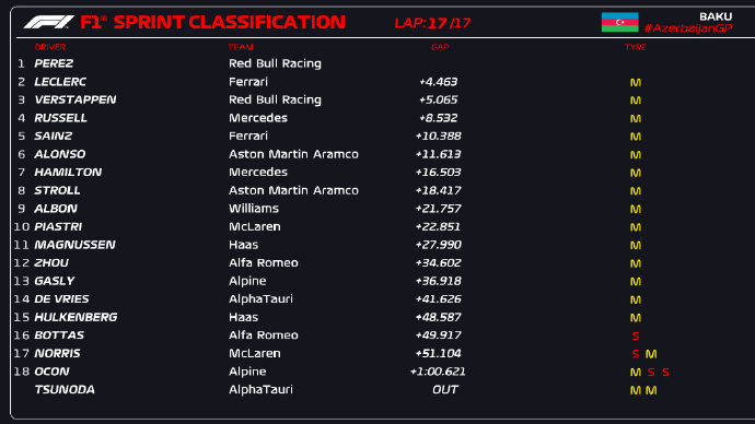 篮球直播吧讯 2023年F1阿塞拜疆大奖赛冲刺赛,红牛车队的塞尔吉奥·佩雷兹取得冲刺赛胜利,收获8个积分!法拉利车队的勒克莱尔第二,维斯塔潘驾驶受损的赛车取得第三,排名第四至八位的车手分别是,拉塞尔、塞恩斯、阿隆索、汉密尔顿、斯托尔。冲刺赛前八名的车手将分别获得8-7-6-5-4-3-2-1分!