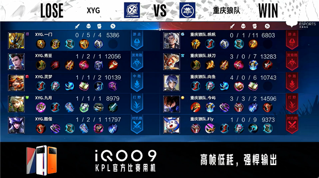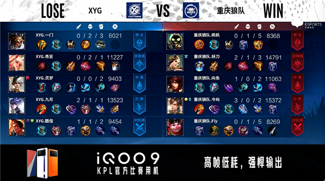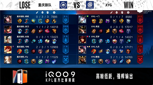 双方常规开局。3分46秒XYG拿下暴君。3分55秒重庆狼队拿下主宰。4分53秒主宰处团战重庆狼队打出1换2。5分40秒双方中路1换1。6分整XYG摧毁敌方对抗路外塔。7分29秒XYG摧毁敌方中路外塔。8分09秒XYG拿下暴君。8分58秒XYG发育路击杀澜。9分10秒XYG摧毁敌方发育路二塔。10分17秒XYG拿下暴君。10分25秒野区团战重庆狼队打出0换2。11分53秒重庆狼队摧毁敌方中路外塔。14分30秒重庆狼队拿下暗影暴君。15分44秒重庆狼队拿下暗影主宰。16分12秒重庆狼队野区击杀鬼谷子。16分28秒重庆狼队摧毁敌方发育路高地塔。16分40秒重庆狼队摧毁敌方中路二塔。16分50秒重庆狼队摧毁敌方对抗路高地塔并击杀沈梦溪。17分14秒重庆狼队摧毁敌方中路高地塔。17分27秒重庆狼队团灭对手摧毁水晶拿下比赛。