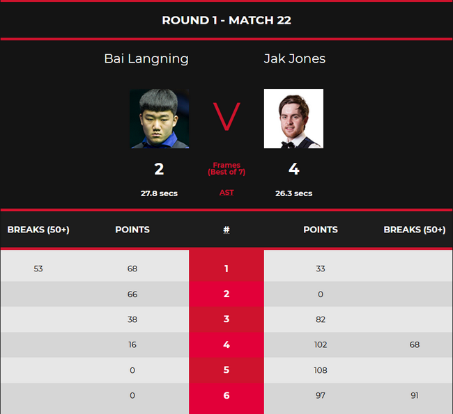 小将白朗宁是第2比赛日唯一被淘汰出局的中国选手。顶替退赛的张健康出战的他,面对的是赛会65号种子杰克-琼斯。比赛中,白朗宁首局打出单杆53分,以68-33先胜一局。第二局,他又通过多次上手,以66-0零封对手。但0-2落后的杰克-琼斯,此后开始发威,他在第4局和第6局分别打出单杆68分和91分,以82-38、102(68)-16、108-0和97(91)-0连扳4局,大比分4-2逆转胜出。