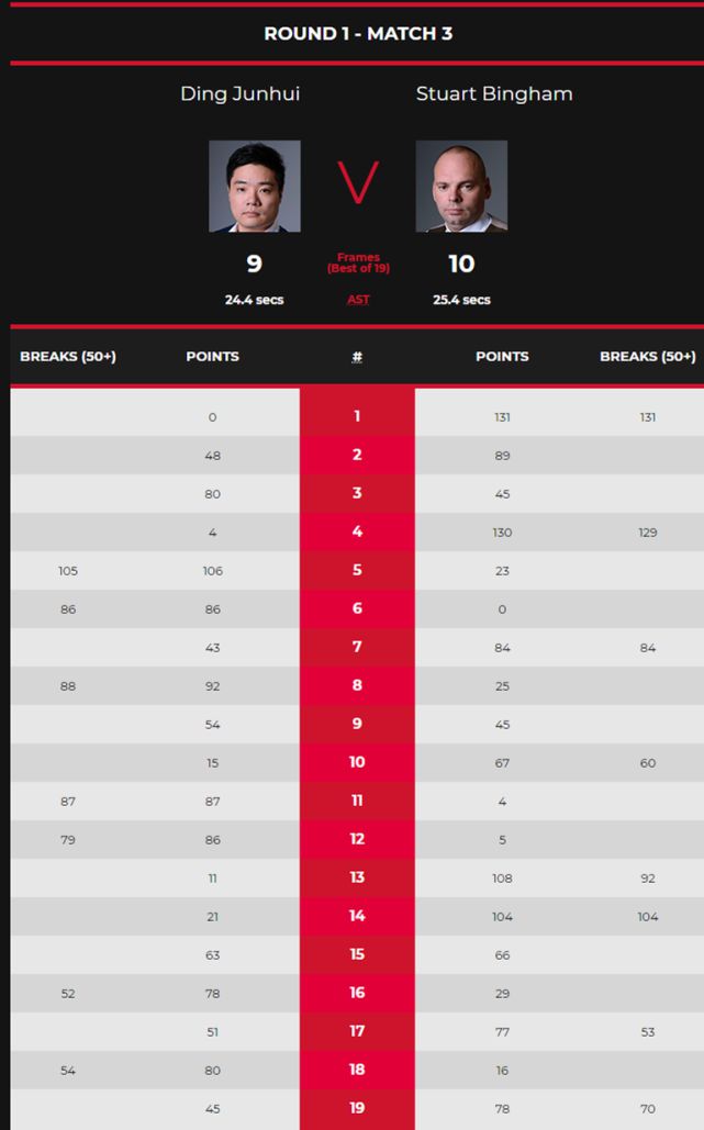 两人比赛的第1局,宾汉姆就展现了远台准度,轰出单杆破百131分清台。第2局,两人失误较多,宾汉姆在乱局中赢下,分差扩大为2-0领先;第4局,丁俊晖把握住了宾汉姆的失误,顺势拿下,拿下首局1-2落后;第4局,宾汉姆又展现了单杆得分能力,轰出第2杆破百,单杆129分拿下,以3-1进入到中场休息。