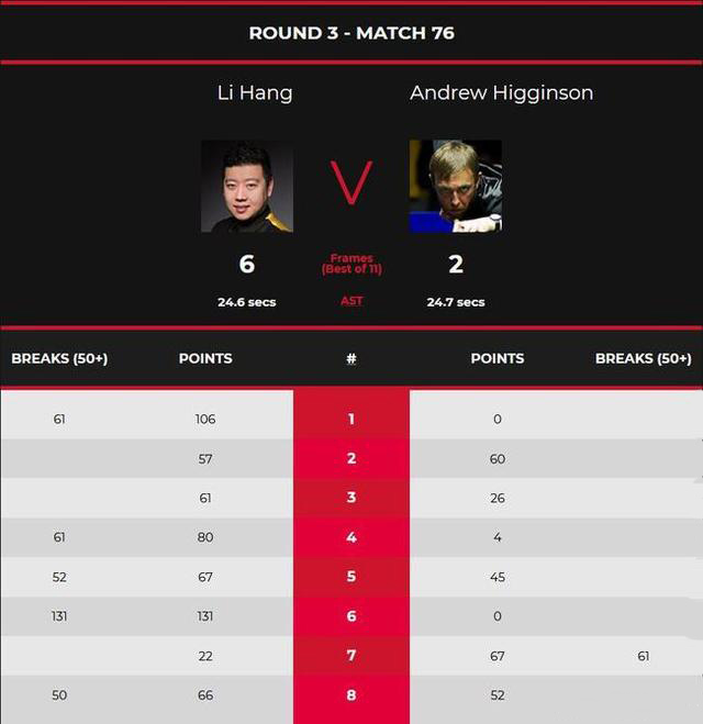 首局李行单杆61分,以106-0开局。第2局,希金森60-57惊险追回一局。双方1-1。随后李行发威,61-26拿下第3局;单杆61分,以80-4拿下第4局;第5局轰出单杆52分,以67-45再胜一局,第6局更是轰出全场唯一破百杆——单杆131分,以131-0一杆制胜,大比分5-1拿到赛点。