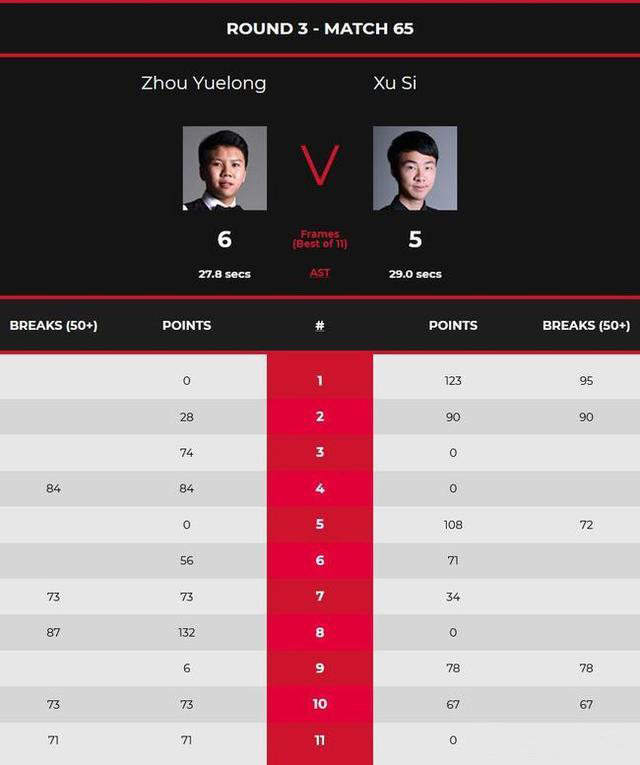第5局,徐思单杆72分,冲击147失败,周跃龙进攻不进,徐思单杆36分拿下。第6局,徐思52-0领先,周跃龙追分,周跃龙单杆45分,以56-52领先,结果周跃龙咖啡球不进,母球摔袋;徐思单杆15分,拿下。徐思4-2领先。