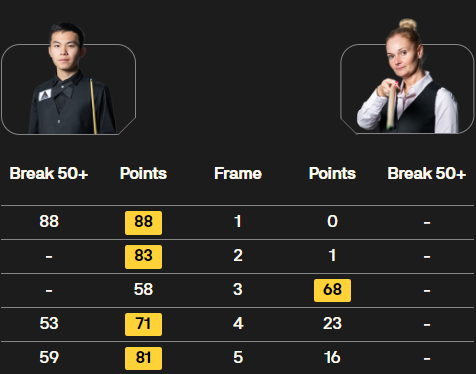 第五局:刘宏宇在这一局中状态依旧,单杆连胜四局的表现,以4-1的总比分击败瑞安-埃文斯,晋级下一轮。