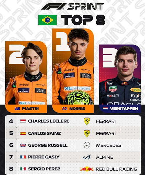 篮球直播吧讯 北京时间11月2日,F1巴西站冲刺排位赛结束。皮亚斯特里夺得杆位,诺里斯、勒克莱尔位居二三。维斯塔潘第4,劳森第8,博塔斯第15,周冠宇第20。汉密尔顿、佩雷兹止步SQ2。
