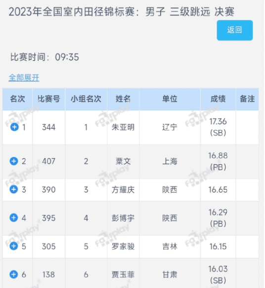 来源:篮球直播吧03-17 16:06篮球直播吧03月16日讯全国室内田径锦标赛继续进行,男子三级跳远落下帷幕,最终辽宁选手朱亚明第三跳17米36,成功夺得冠军。这位东京奥运会银牌、世锦赛铜牌获得者表现强势,创造PB。亚军属于来自上海的粟文,他跳出了16米88,也创个人PB。第三名属于陕西的方耀庆,他的成绩是16米65。