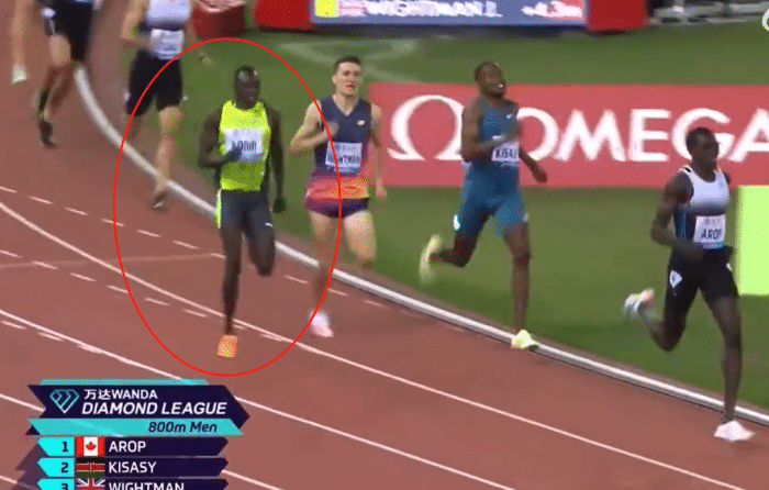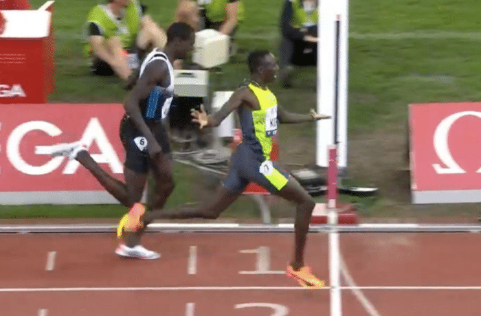 没有想到在国际田联钻石联赛总决赛上,科里尔上演了完全相同的一幕。在比赛前半段,科里尔一直采用跟随跑的方式,排名并没有很高。在进入到第二圈还剩最后150米时,科里尔开始在弯道加速。当时处于第5位的科里尔,直接从外道开始加速超越。