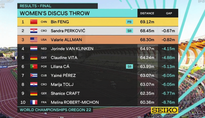 来源:篮球直播吧07-21 14:46篮球直播吧07月21日讯 ,俄勒冈田径世锦赛传来喜讯!在女子铁饼决赛中,中国选手冯彬凭借第一掷投出的69米12,以刷新个人最好成绩的方式夺得金牌!这也是中国铁饼时隔11年在该项目上再度夺得世锦赛金牌。这一块金牌,冯彬也创造了多项纪录!
