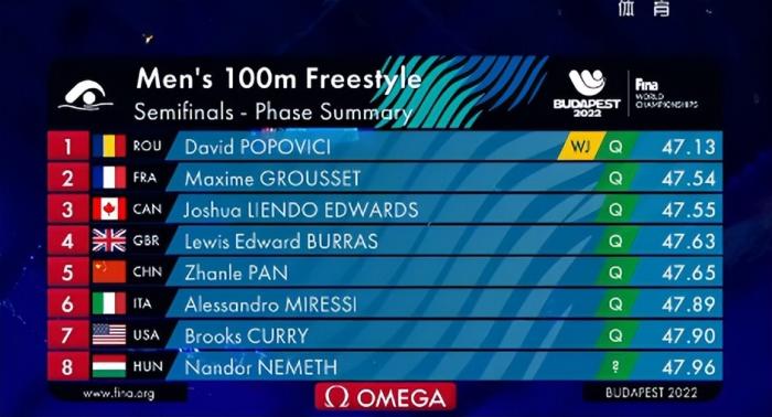 在预赛中,潘展乐便游出48秒19的成绩,这一成绩已经令人感到激动,也创造了这位18岁小将的个人最好成绩。而来到半决赛,潘展乐继续提升自己的竞技状态。在半决赛第2组中,潘展乐游出了47秒65的成绩,排名小组第4总成绩第6位,顺利晋级决赛!毫无疑问,这是一个惊人的成绩。罗马尼亚天才波波维奇,47秒13刷新世界青年纪录第一晋级。
