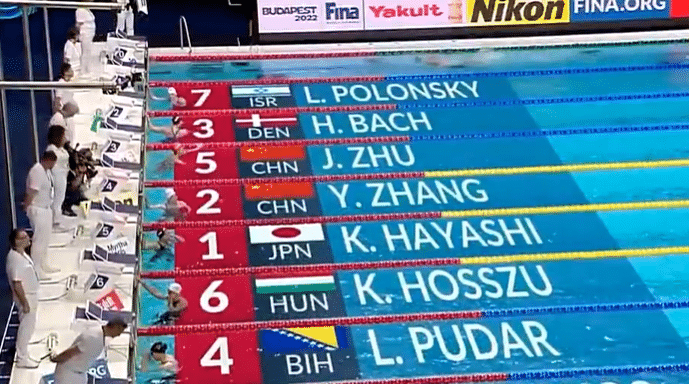 50米转身的时候,张雨霏排名第一,领先第二名足足1.30秒,优势很大;