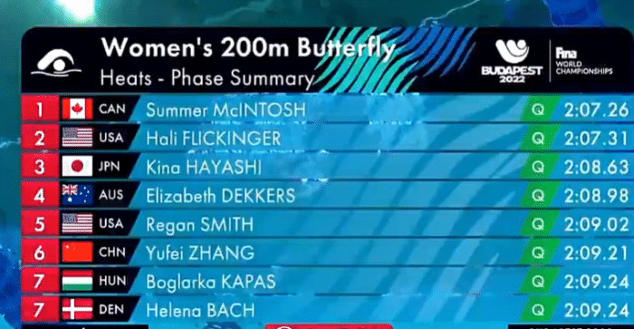 200米蝶泳预赛总成绩,张雨霏排名第六,轻松晋级;