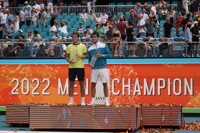 来源:篮球直播吧04-06 20:00篮球直播吧04月06日讯 上周日,18岁的阿尔卡拉斯成为迈阿密公开赛历史上最年轻的冠军,也是史上第三年轻的大师赛冠军得主。这一胜利对这位西班牙人来说是一个星光闪耀的赛季开始,他之前也成为了里约热内卢ATP 500赛事历史上最年轻的冠军。目前,他已经在对阵前10名选手中取得了7场胜利。这位世界排名第11的选手被誉为未来的世界第一,有一天他很可能会取代他的偶像纳达尔成为西班牙网球的领袖。尽管纳达尔目前没有打算在短期内退役,但一位前大满贯决赛选手相信,他的年轻同胞会刺激纳达尔在巡回赛上更加努力。