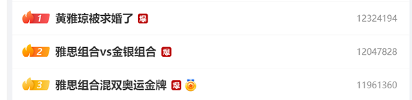 黄雅琼和刘雨辰在今年520官宣恋情,如今时隔将近3个月,刘雨辰在黄雅琼夺冠圆梦后成功求婚;黄雅琼被求婚瞬间冲上热搜榜第一位,另外“雅思组合混双奥运金牌”等词条也冲上热搜。