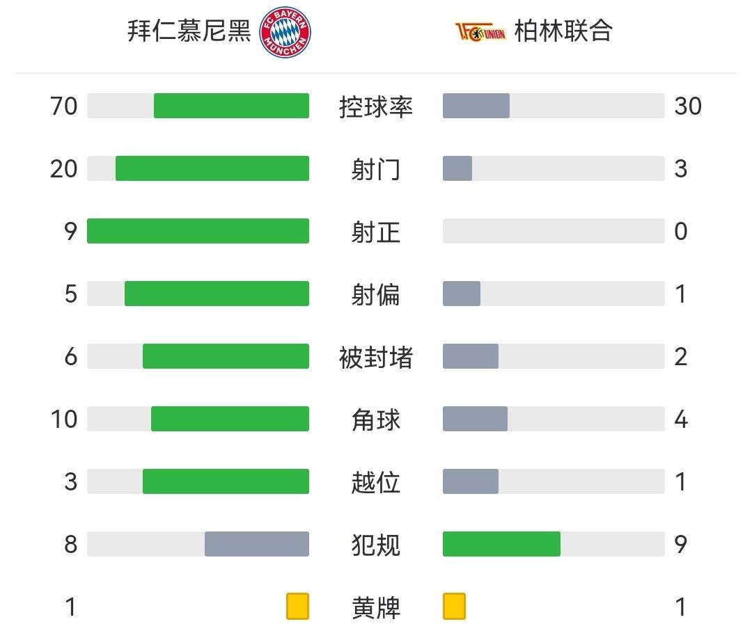 全场比赛结束,拜仁慕尼黑3-0柏林联合。