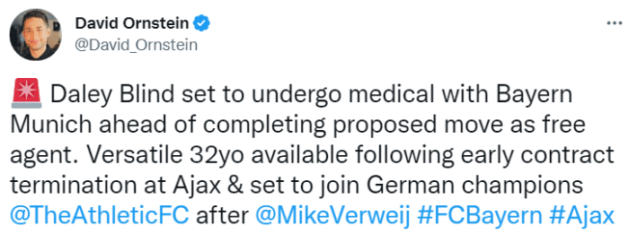 奥恩斯坦表示,布林德将接受体检并以自由球员的身份加盟拜仁,这位32岁的后场多面手球员在世界杯结束后与阿贾克斯提前终止了合约。