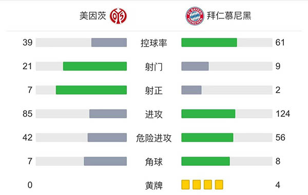 全场比赛结束,美因茨3-1战胜拜仁慕尼黑。