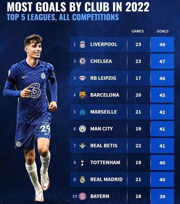 篮球直播吧04月15日讯 德国转会市场统计了2022年以来五大联赛球队的进球排名,利物浦49球力压切尔西排名第一。