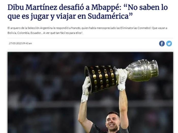 马丁内斯回击姆巴佩言论:来南美踢球试试