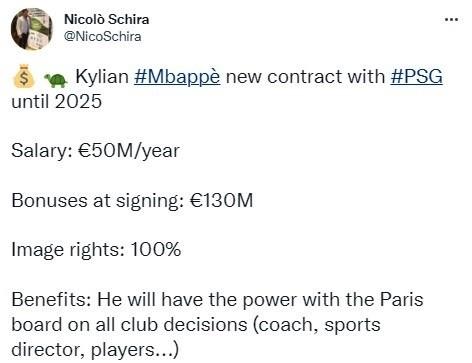 姆巴佩不仅将获得足坛最高年薪,还将享有一系列特权。例如在新任体育总监和下一任主帅的聘用上,姆巴佩有发言权。此外为了冲击欧冠冠军,巴黎许诺将进行强有力的引援。此前,姆巴佩长期以来对巴黎的竞技计划持怀疑态度,但经过漫长的谈判,巴黎的高层成功地改变了他的想法。