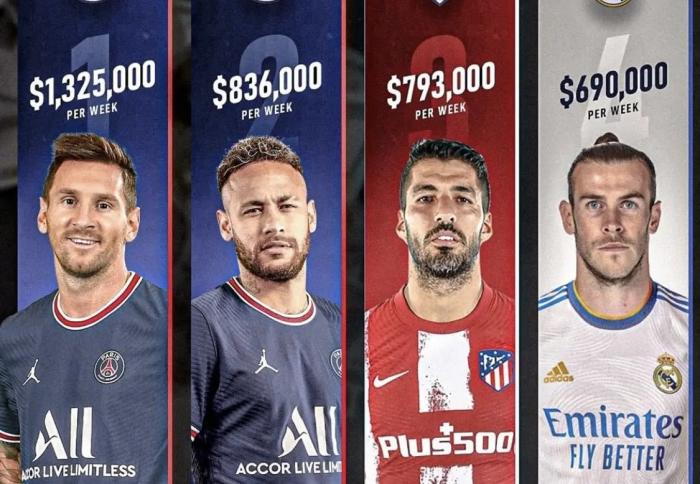 来源:篮球直播吧09-17 15:50篮球直播吧9月17日讯讯:足球运动员作为普通人眼中的高收入职业,其中的顶尖球星可以拿到非常高昂的薪水。近日美国媒体ESPN就统计了现役球员当中周薪最高的8名球员,其实周薪这个概念之前只有英超存在,其他联赛大部分是直接以年薪而计算的。