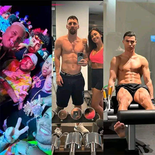 由于美职联处于漫长休赛期,与家人享受惬意度假时光的阿根廷球王梅西,依然在努力健身。在梅西晒出的照片中,他和妻子安东内拉在健身房挥汗如雨锻炼。与梅西一样,刚踢完上轮沙特联赛的C罗,也没有放松。在罗总裁晒出的健身照片中,他再次展现了自己8块如雕塑般完美的腹肌。绝代双骄如此自律,这也难怪他们可以保持巅峰这么多年。
