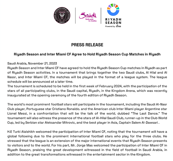 梅罗对决!迈阿密国际将战利雅得胜利 官方宣言:最后一舞