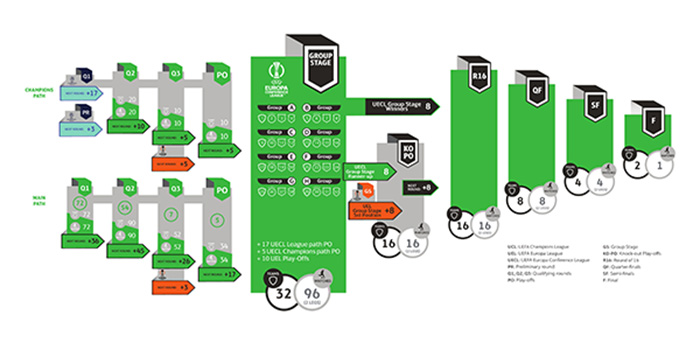 小组赛共有32支俱乐部参加,分为8个小组;欧联小组第二(8队)在欧联附加赛对阵欧冠小组第三(8队),优胜的8支球队在1/8决赛对阵欧联小组第一(8队); 欧联小组第三(8队)在欧协联附加赛对阵欧协联小组第三(8队),优胜的8支球队参加欧协联淘汰赛。
