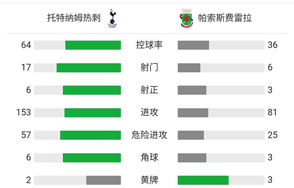 来源:篮球直播吧08-27 09:52 篮球直播吧讯:北京时间8月27日02:45,欧协联附加赛次回合,热刺主场迎战帕索斯费雷拉(首回合热刺0-1落败)。上半场凯恩梅开二度,希尔献助攻外加中柱;下半场洛塞尔索任意球造成安图内斯乌龙。最终,热刺3-0帕索斯费雷拉,总比分3-1晋级正赛。