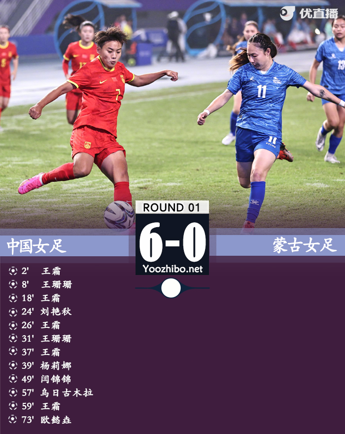 篮球直播吧讯 9月22日讯 北京时间9月22日19:30,亚运女足小组赛A组第1轮,中国女足对阵蒙古女足。上半场,王霜上演大四喜并送出一次助攻,王珊珊双响,刘艳秋、杨莉娜各入一球!下半场,闫锦锦、张馨、乌日古木拉打入两球,王霜传射上演五子登科,欧懿垚破门建功!全场比赛结束,中国女足16-0蒙古女足!