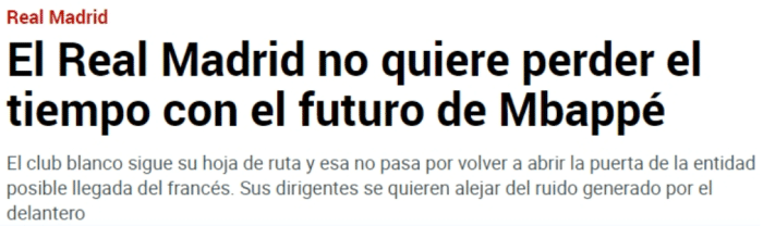 今夏引进姆巴佩失败后,有消息称皇马仍对这名法国前锋保持关注,但《马卡报》表示,皇马已经不愿意再在他身上浪费时间。