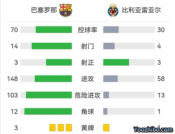 全场比赛结束,巴塞罗那0-2比利亚雷亚尔。