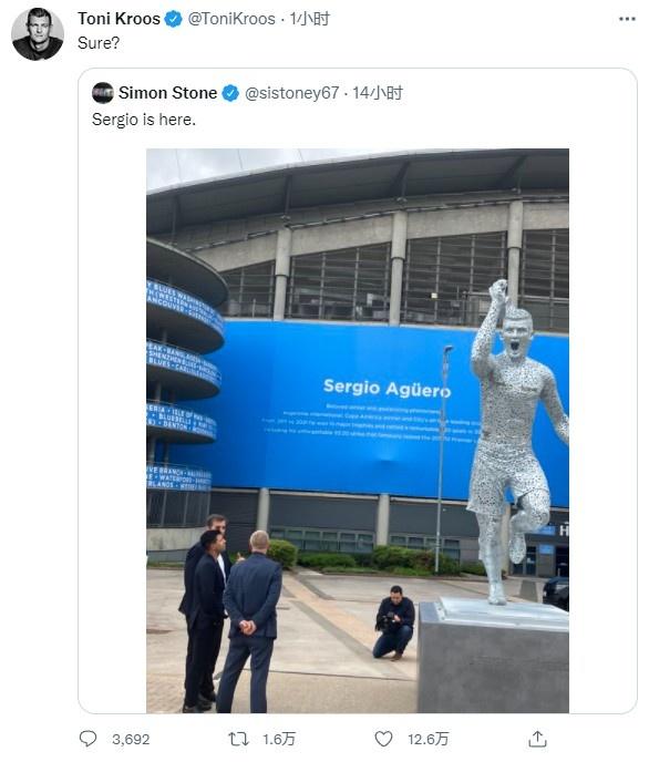 篮球直播吧05月14日讯 消息,有网友称曼城的阿圭罗雕像神似皇马球星克罗斯,克罗斯在推特上做了回应。