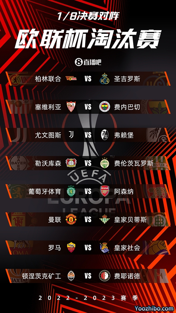 篮球直播吧讯 2月24日讯欧联杯1/8决赛对阵抽签结束,阿森纳遭遇葡萄牙体育,曼联对阵贝蒂斯,尤文碰上弗赖堡,罗马交锋皇家社会。
