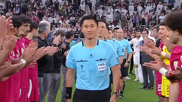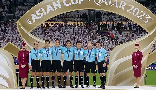 比赛结束之后的颁奖仪式,执法决赛的中国裁判马宁领取决赛纪念奖牌,值得一提的是,本场比赛的马宁一共判罚3次点球给卡塔尔,都是没有任何争议的判罚。