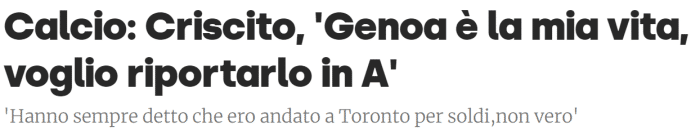《罗体》称,热那亚上赛季降级目前处于意乙联赛,克里西托今年1月复出想帮助自己的母队重返意甲。为此,他愿意只领2274欧元的月薪,并且放弃了多伦多FC开出的250万欧元年薪的续约合同。